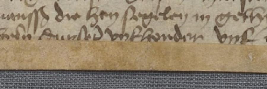 Arnt van Uden als man ende mombair van Dircxken sijnder huijsvrouwen dochter wilner Jans van ǁ Thijenrode een stuck ackerlants een lopensaet ende seventhien roeden off daer omtrent begrijpende ǁ gelegen inder prochie van Oesterwijck ter stede geheijten Huecelum voir d'Broeck aldaer ǁ tussen die gemeijne straet nae Tilborch gaende aen deen sijde ende tussen den erve Wouter Cornelisz. ǁ aen dander sijde welck stuck lants voirs. Arnden als man ende mombaer van Dircxken sijnder ǁ huijsvrouwen voirs. overmidts der doot wilner Jans van Thijenrode ende wilner Mechtelden sijnre ǁ huijsvrouwen moeder Dircxken voirs. metten recht van versterve erffelijck aencomen is ende ǁ in eender erfdeijlinge metten heeren vanden lande gedaen te deele gevallen is gelijck in ǁ scepenen brieven vanden Bosch daer op gemaeckt volcomelijck is begrepen heeft hij wittelijck ǁ ende erffelijck opgedragen ende overgegeven Jannen soen wilner Andries van Gilse ǁ metten voirs. brieven ende mett allen den recht hem daerinne enichsins toebehorende met ǁ afgaen ende verthijen als dat gewoenlijck is. Ende heeft geloeft Arnt voirs. als sculdenaer ǁ principael op hem ende alle sijne gueden die hij nu heeft ende namaels hebben ende ǁ vercrijgen sall mogen dit voirs. stuck lants den voirs. Jannen te waeren als men erffenisse ǁ schuldich is te waeren ende allen commer ende calaengie daer inne wesende alte mael afte doenen ǁ oirconden hebben hier over geweest scepenen in Oesterwijck Wouter Roelof Peijnenborch ǁ ende Claes Jan Tijmermanss. die hen segelen in gethuijchgenisse hier aen hebben ǁ gehangen. Int jaer Ons Heeren duijsent vijfhondert vijf ende dartich den achtsten dach januarij
