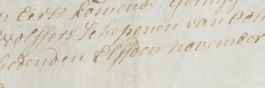 Francis Couwenbergh als in huwelijck hebbende Elisabeth ǁ Wijtmans, Een stuck ackerland groot ontrent twee loopens gelegen onder dese vrijheijd ǁ van Oosterwijck in de Schijff, tussen erffenisse van d'abdije van Sint Geertruij tot Loven ǁ aen d'eene zijde, ende tussen een gemeene wegh, ende Bosbaen aen d'andere zijde, streckende ǁ met den eenen eijnde van erffenisse van de erffgenamen Jan Vromans van Gestel, ende met den ǁ anderen eijnde tot aen een gemeene miswegh hem aengecomen bij deijlinge van sijne vrouwe ǁ ouders soo hij verclaerde als hij seijde heeft hij mondelingh verkogt wettelijck ende ǁ erffelijck opgedragen ende overgegeven aen seigneur Adriaen van Dal omme bij den selve ǁ in een erffrecht te hebben ende te besitten geloovende de voorn. verkoper als een schulde ǁ naer principael op hem ende op alle sijne goederen hebbende en vercrijgende het ǁ voors. perceel te waeren als men erve schuldig is te waeren ende allen commer calan ǁ ge ende aentael daer inne wesende de selve aff te doen geheelijck losen vrij aen te ǁ veerden aenstonts, mids dat den cooper moet gebruijcken de coolen ent gruen daer ǁ op staende tot Paessen eerst komende, Getuijgen waeren hierover Aert Egen Teurlings ǁ ende Caerl Frederick Wolffers schepenen van Oosterwijck die dese ten prothocolle ǁ hebben onderteekend heden den elffden november XVIIc ende twintigh