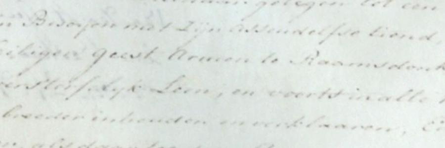 De Administrateurs gesteld over de door de Franschen geabandonneerde goederen van ǁ den Vorst van Nassau, doen hiermede te weeten, dat voor ons thans voorzittend meedelid Meester Joǁhannes Jacobus Loke fungeerende als Stadhouder der Leenen van Polanen in Leenmannen ǁ hier nagenoemd, verscheenen en gecompareerd is, Bastiaan Holster, woonende te Raamsdonk ǁ en denzelve voorbehoudens ons en eenijders goed recht, hebben verleid en beleend, verleijen en verǁleenen bij dezen onze brieven gemelde Bastiaan Holster woonende te Raamsdonk ten behoeven van ǁ den Heiligen geest armen aldaar met de navolgende vier parceelen van leenen, als eerst, negen ǁ gaarden of morgen lands, uit agtien morgen of gaarden lands gelegen in den ambagte van Raamsdonk ǁ bij de kerk in’t Molenweer, strekkende van de Donge af noordswaards op ter halver maze toe, en nog vijf’t ǁ halff gaarden lands, uit de voorsz. agtien morgen, gelegen in’t Molenweer voornoemd tot twee leenen; Item ǁ nog vijf’t halff morgen uit de voorsz. agtien morgen, geleegen en strekkende als voren, tot een leen, ǁ jegenwoordig belend ten oosten Jan Otjens cum suis, ten westen den Heiligen geest armen voornoemd cum suis, ten zuiǁden de ‘S Gravenmoertse vaart, en ten noorden halver donge, En laatstelijk nog een tiende gelegen in Raamsǁdonk, en nog twee hoeven tienden mede aldaar gelegen tot een leen, belend ten Oosten de Kerk van Raamsǁdonk ten westen den Heer van Besoijen met zijn assendelfse tiend, die daar mede op den 30e Meij 1754 laast, ǁ als sterfman van den Heiligen geest armen te Raamsdonk, is verleijd geweest: Te houden van den huijǁze van Polanen, als een onversterfelijk leen, en voorts in alle manieren, als de oude handvesten en reǁgisteren, daar van zijnde, breeder inhouden en verklaaren, En van deze voors. leenen heeft ons de voorǁ noemde Bastiaan Holster, als daar toe door Armmeesteren van Raamsdonk bij acte voor Schout en ǁ verdere municipaliteits leeden van Raamsdonk op den 20e Maart 1797 geconstitueert, voor de ǁ meergemelde Heijligen geest armen, als Sterfman, hulde en manschap, als dat behoorde, gedaan ǁ in handen van ons voorzittend medelid en fungeerende Stadhouder voornoemt en Leenmannen Johannes ǁ de Milleville en Carel Quant, egter met dien verstande dat, wanneer gemelde Bastiaan Holster ǁ mogt komen te overlijden, de Armmeesters van Raamsdonk indertijd, als dan binnen een jaar een ander ǁ hulder en sterfman indeszelvs plaats zullen moeten nomineeren ǁ Aldus gedaan en gepasseert in den Haag den 24e Maart 1797. Het derde Jaar der Bataafsche Vrijheid. ǁ J.J. Loke voorzitter ǁ